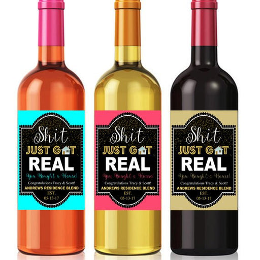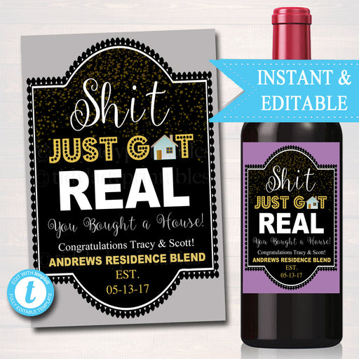 Housewarming Gift Label Shit Just Got Real Printable Wine Bottle label New House Wine Label, You Bought a New House Blend, Congrats