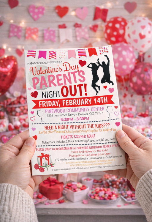 EDITABLE Valentine's Day Parents Night Out Flyer, Printable PTA, PTO, School Family Fundraiser Event, Community Center Church Digital Invite